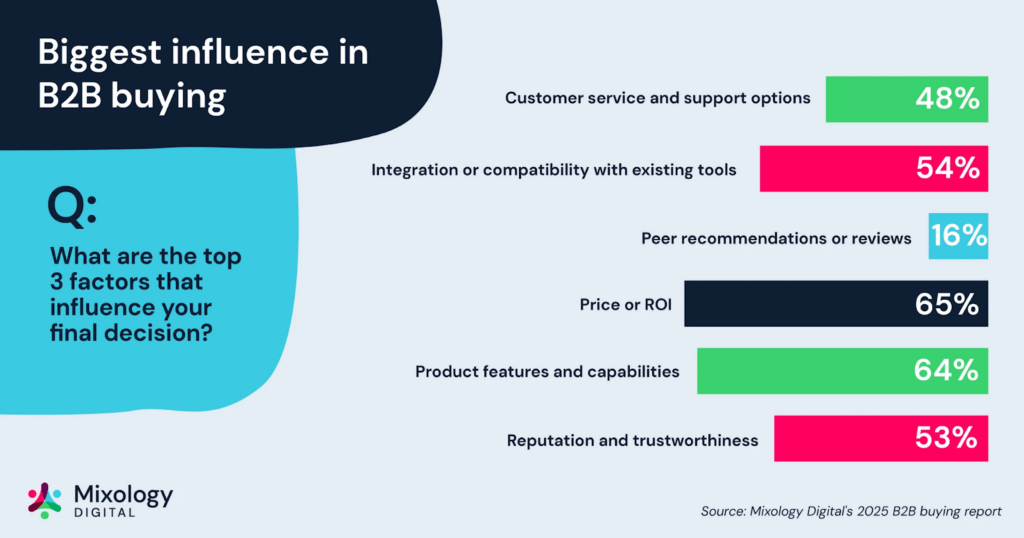 - Price: How much you charge and your pricing strategy. This encompasses the list price, discounts, payment terms, and the overall perceived value of the offering. Pricing must align with the value delivered and market expectations. In B2B, communicating ROI is crucial – 65% of B2B buyers say price and ROI are the most influential factors in purchase decisions (2). (We’ll explore how sales teams can reinforce value-based pricing in outreach.)