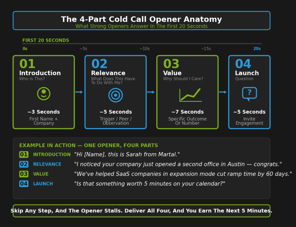 At Martal, we’ve run cold-calling motions for B2B clients across more than 50 verticals over the past 16 years — and the pattern is consistent. The teams who succeed aren’t the ones with the cleverest script. They’re the ones whose openers earn the right to continue the conversation in the first 10 seconds. Everything downstream — qualification, discovery, booked meeting — follows from that.