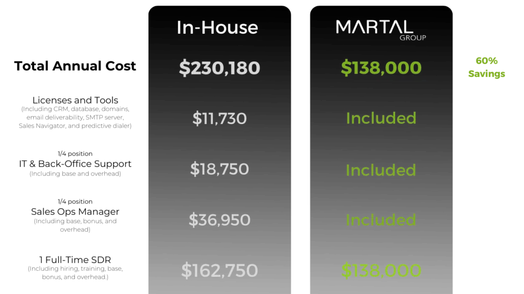 Costs vary by model: retainers ($5k–$12k+/mo), dedicated US SDRs ($7k–$15k+/mo per rep), or pay-per-meeting ($250–$1,200/qualified meeting). Martal offers a free ROI estimate to compare to in-house alternatives.