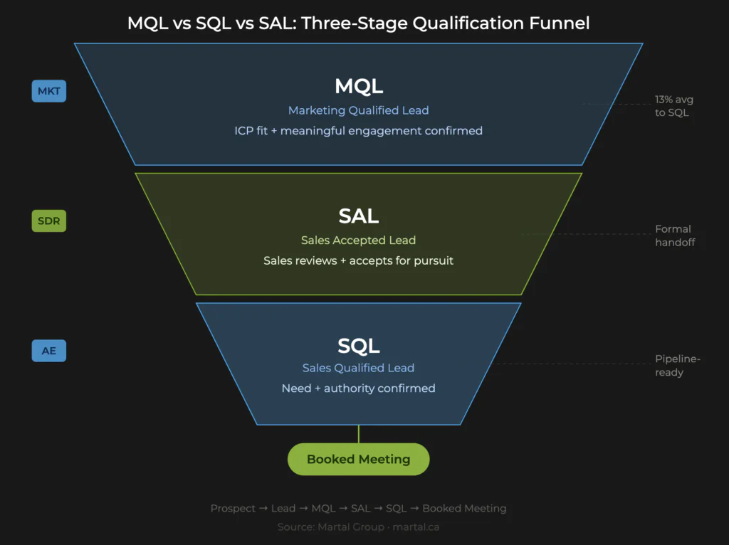 A Sales Accepted Lead (SAL) sits between MQL and SQL — it’s an MQL that sales has formally reviewed and accepted as worth pursuing before the qualification conversation begins. The full progression is: Prospect → Lead → MQL → SAL → SQL → Booked Meeting. Not every team uses SAL as a distinct stage, but in structured revenue teams with an SDR-to-AE handoff, it adds a critical accountability layer.