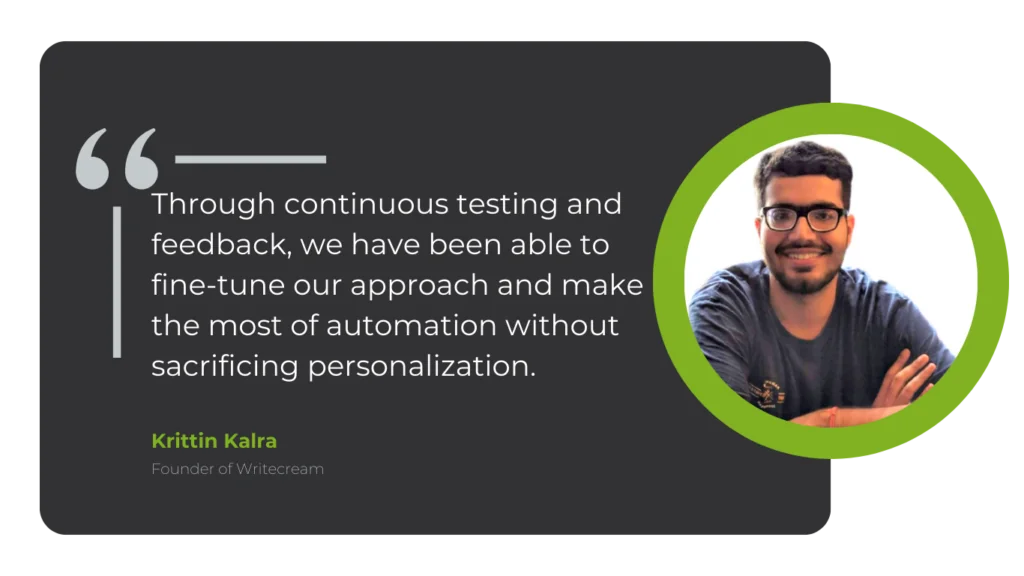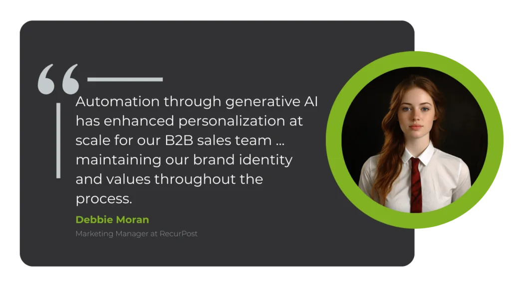 “Automation through generative AI has enhanced personalization at scale for our B2B sales team at RecurPost, maintaining our brand identity and values throughout the process. By finding the right balance and integrating AI into our sales process, we’ve managed to streamline outreach efforts, engage with prospects more effectively, and ultimately improve our sales performance while keeping RecurPost at the forefront of our messaging.”